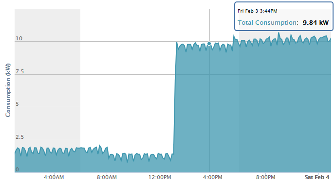 Een YouLess gebruiker stuurde deze Bidgely grafiek in. In de grafiek is te zien dat er een verbruiker van maar liefst 8,5 kW gedurende een halve dag aan heeft gestaan. Om een idee te geven van hoeveel dat is: bij de meeste huishoudelijke enkelfase aansluitingen slaat de hoofdzekering in de meterkast bij ongeveer 8kW door (40A zekering).