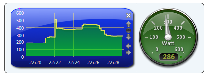 Verder is er een extra schaal aan de Gadget toegevoegd die tot 18kW gaat. In de vorige versie ging de hoogste schaal tot 6kW. Dit is voor een gewone enkelfase aansluiting die de meeste huishoudens hebben wel voldoende, maar in huishoudens met een 3 fase aansluiting kan er wat meer vermogen getrokken worden. Bovendien wordt de YouLess steeds meer in bedrijven gebruikt waar de 6kW grens ook vaak overschreden wordt. De Gadget en flyout grafiek kon er dan bijvoorbeeld zo uit komen te zien (voor zover dit nog een grafiek is te noemen):