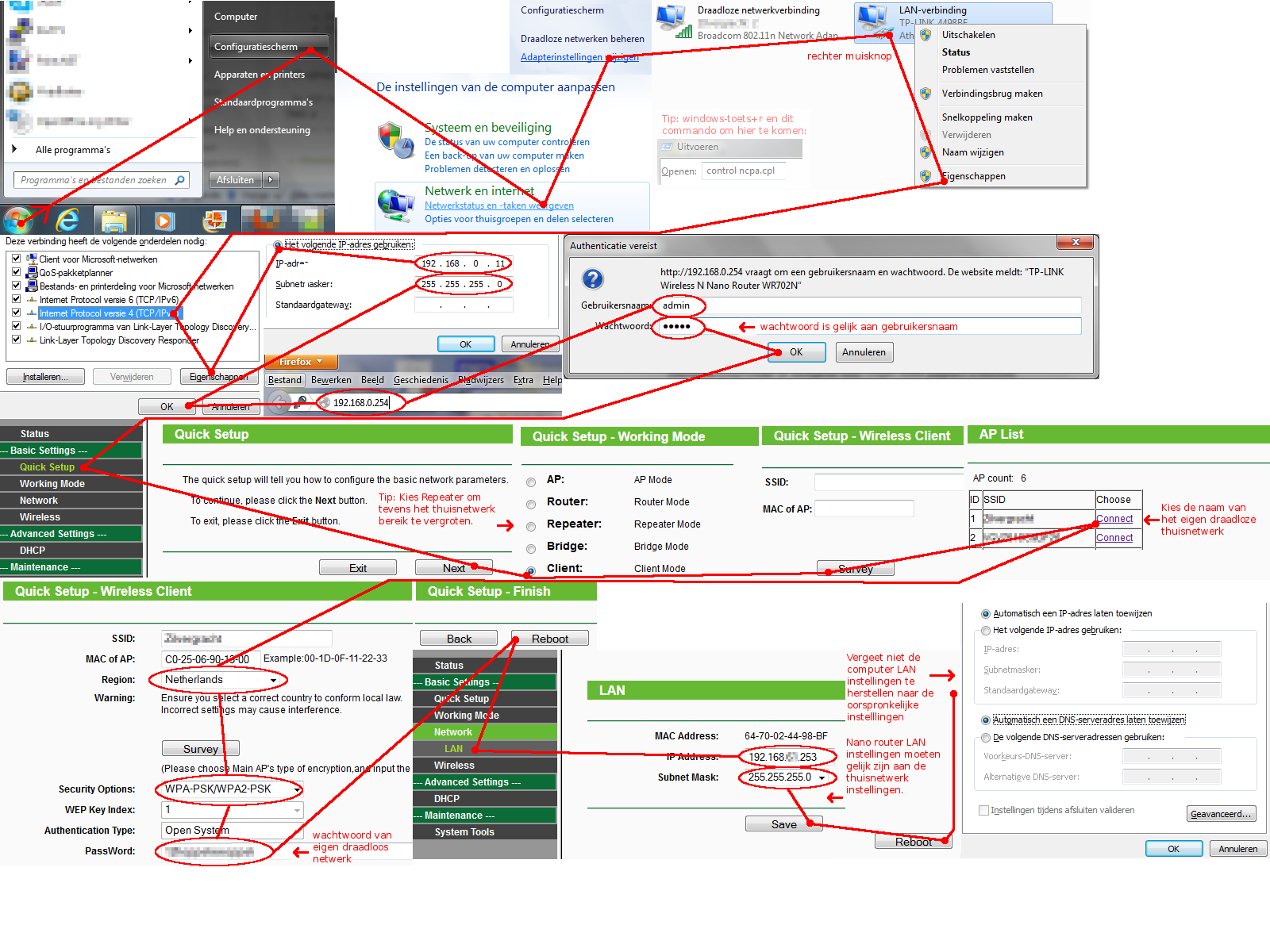Nadat de stappen uit de stap voor stap poster zijn uitgevoerd, moet de Nano router via het (draadloze) thuisnetwerk te bereiken zijn op het ingestelde IP adres, bijvoorbeeld 192.168.1.253. Controleer dit eerst alvorens verder te gaan.